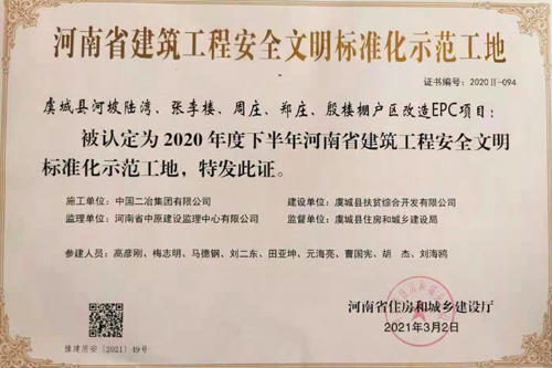 4月1日, 中國二冶鋼構(gòu)分公司承建的虞城棚改項目被河南省住房和城鄉(xiāng)建設(shè)廳評為 2020年下半年“省級建筑施工安全標(biāo)準化示范工地”稱號 ,這是該項目部成立以來繼獲得商丘市“安全標(biāo)準化示范工地”稱號后獲得的又一榮譽,實現(xiàn)了該公司在中原地區(qū)省級安全文明施工獎項方面零的突破。