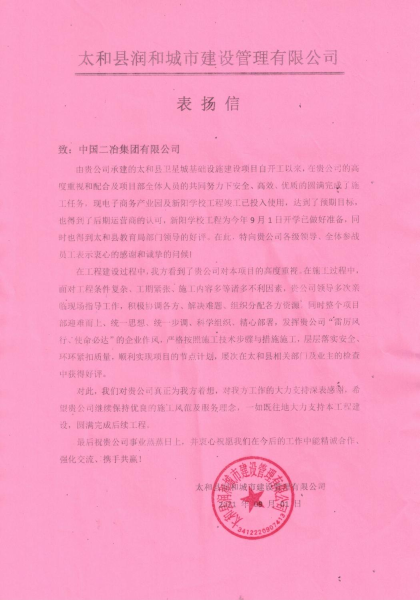 信中太和縣潤和城市建設(shè)管理有限公司對中國二冶在各方面的工作支持深表感謝,希望中國二冶繼續(xù)保持優(yōu)良的施工風(fēng)范及服務(wù)理念,一如既往地大力支持該工程建設(shè),圓滿完成后續(xù)工程。并表示愿與中國二冶集團(tuán)有限公司在今后的工作中能精誠合作,共鑄輝煌!