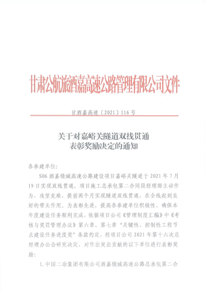 甘肅公航旅酒嘉高速管理公司嘉獎通知