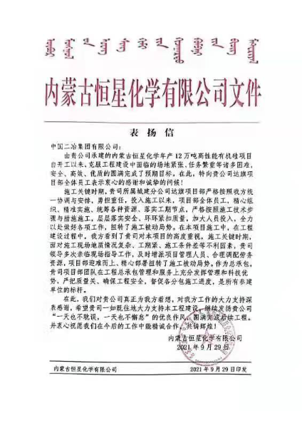 內(nèi)蒙古恒星化學(xué)有限公司向中國二冶集團(tuán)致表揚信