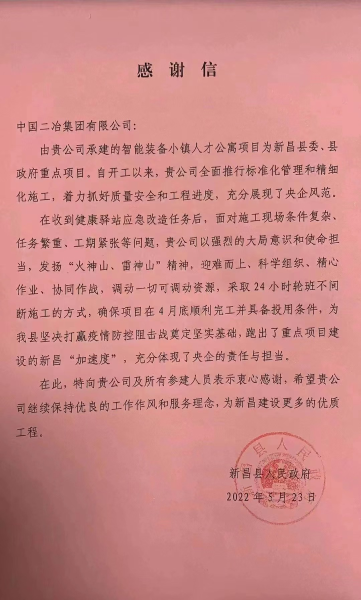5月24日,中國二冶收到新昌縣人民政府感謝信。信中高度贊揚(yáng)了中國二冶在新昌智能裝備小鎮(zhèn)人才公寓項(xiàng)目建設(shè)中,全面推行標(biāo)準(zhǔn)化管理和精細(xì)化施工,全力抓好質(zhì)量安全和工程進(jìn)度,晝夜不停,勇挑重?fù)?dān),充分展現(xiàn)央企擔(dān)當(dāng)。
