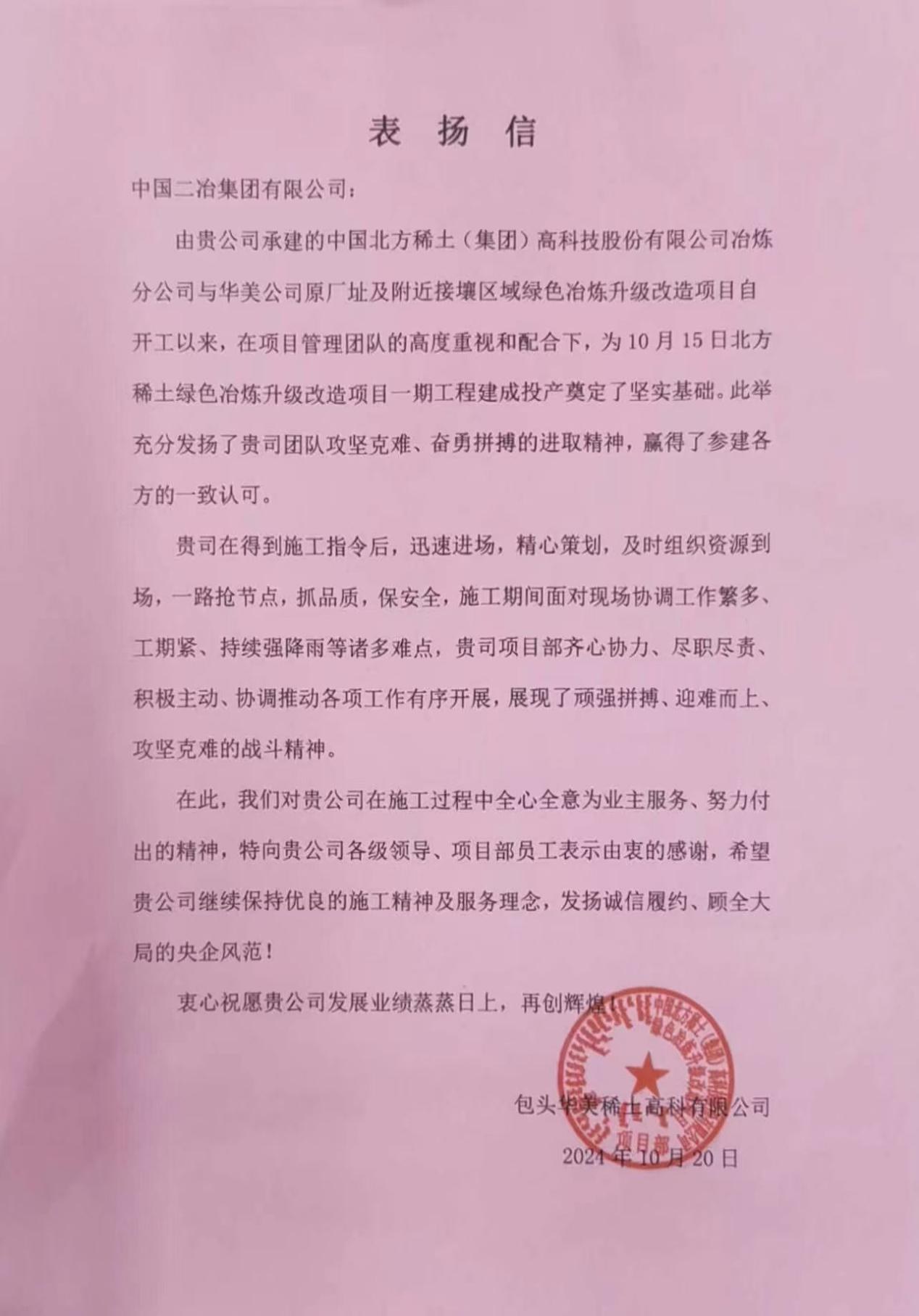 10月23日,中國二冶收到包頭華美稀土高科有限公司表揚(yáng)信,對中國二冶承建的中國北方稀土(集團(tuán))高科技股份有限公司冶煉分公司與華美公司原廠址及附近接壤區(qū)域綠色冶煉升級改造項目在施工過程中秉持敬業(yè)精神、盡心竭力為業(yè)主服務(wù)表示由衷感謝。