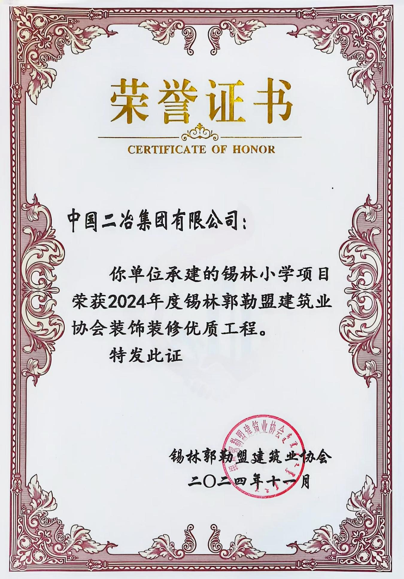 近日,中國(guó)二冶錫林小學(xué)項(xiàng)目獲評(píng)2024年度錫林郭勒盟建筑業(yè)協(xié)會(huì)裝飾裝修優(yōu)質(zhì)工程獎(jiǎng)。