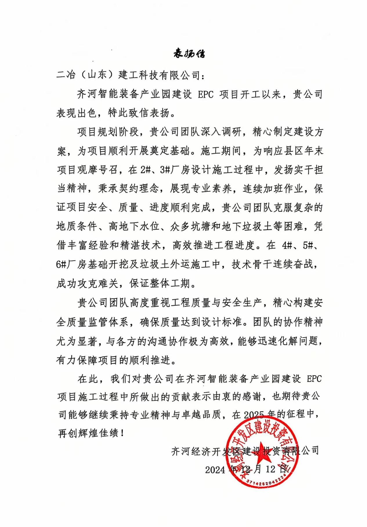 齊河縣經(jīng)濟(jì)開發(fā)區(qū)建設(shè)投資有限公司的來信,對二冶(山東)建工科技有限公司在項(xiàng)目施工過程中的杰出貢獻(xiàn)表達(dá)了由衷的感激之情,并期望其在 2025 年繼續(xù)堅(jiān)守專業(yè)精神,保持卓越品質(zhì),再鑄輝煌佳績。