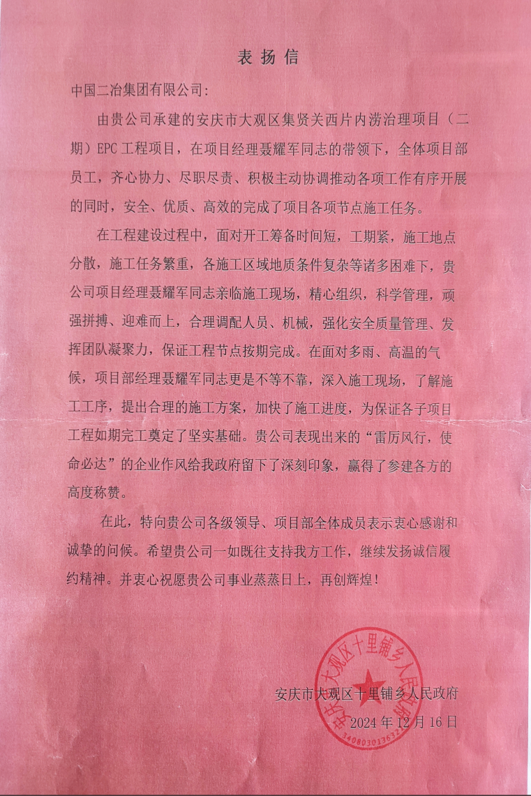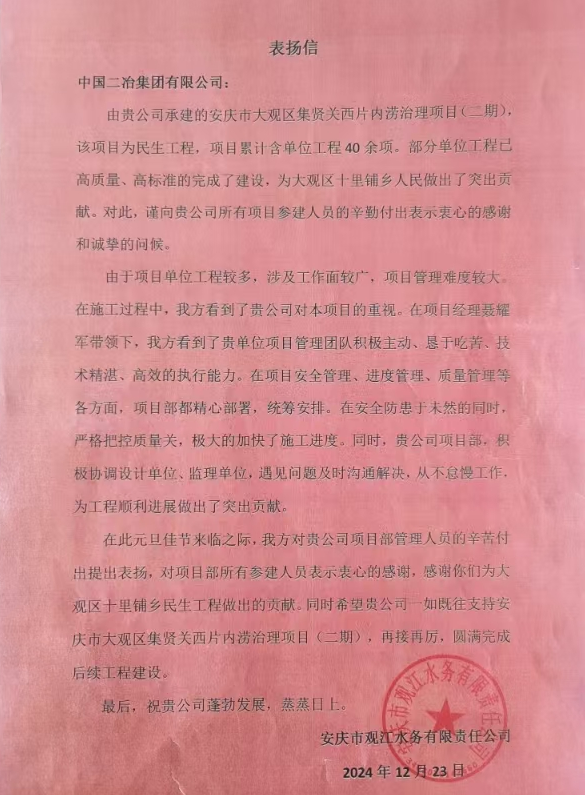 近日,安慶市大觀(guān)區(qū)十里鋪鄉(xiāng)人民政府和安慶市觀(guān)江水務(wù)有限責(zé)任公司給中國(guó)二冶發(fā)來(lái)表?yè)P(yáng)信,對(duì)安慶市大觀(guān)區(qū)集賢關(guān)西片內(nèi)澇治理項(xiàng)目(二期)高質(zhì)量、高標(biāo)準(zhǔn)完成施工任務(wù)給予高度贊揚(yáng)。