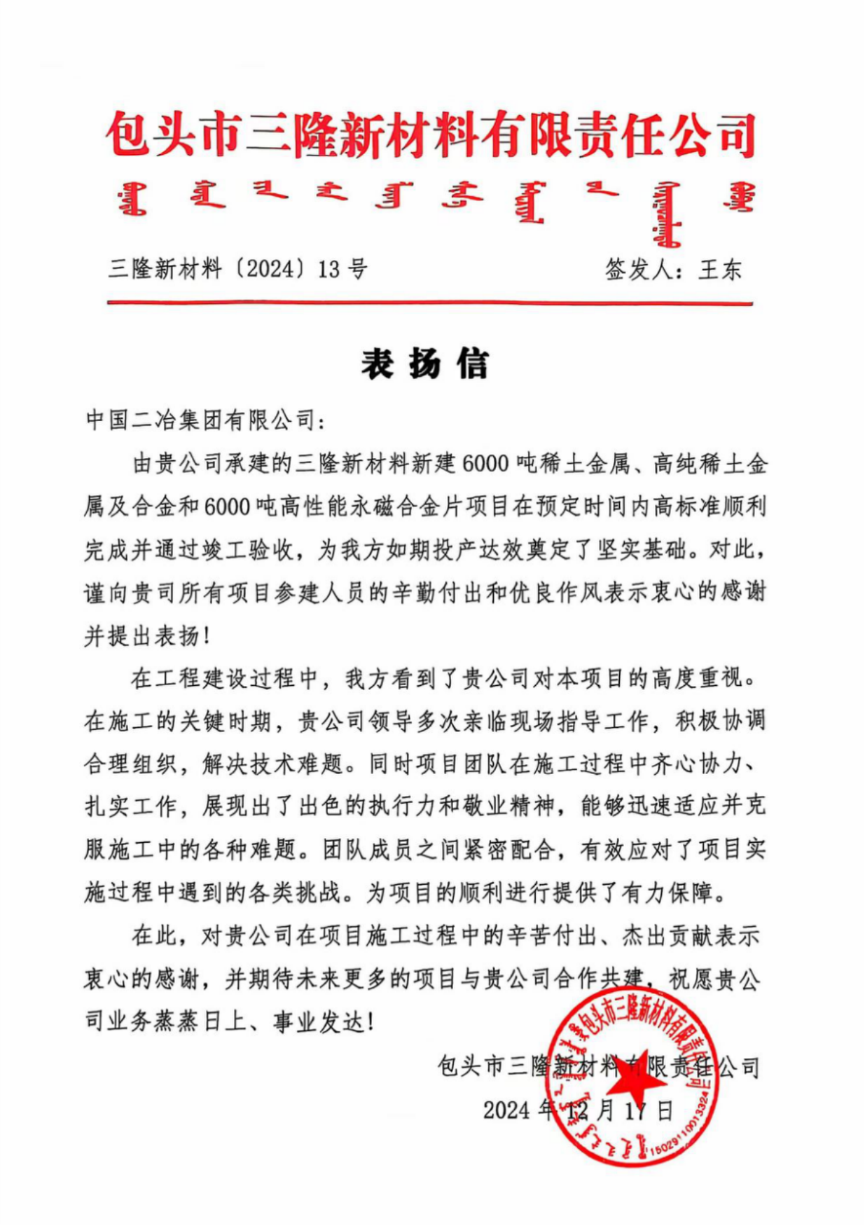 12月25日,中國二冶接連收到包頭金穗實(shí)業(yè)有限責(zé)任公司、包頭市三隆新材料有限責(zé)任公司兩封表揚(yáng)信,對(duì)中儲(chǔ)糧項(xiàng)目、三隆項(xiàng)目管理團(tuán)隊(duì)高質(zhì)量完成既定目標(biāo)工期的杰出表現(xiàn)提出表揚(yáng)。