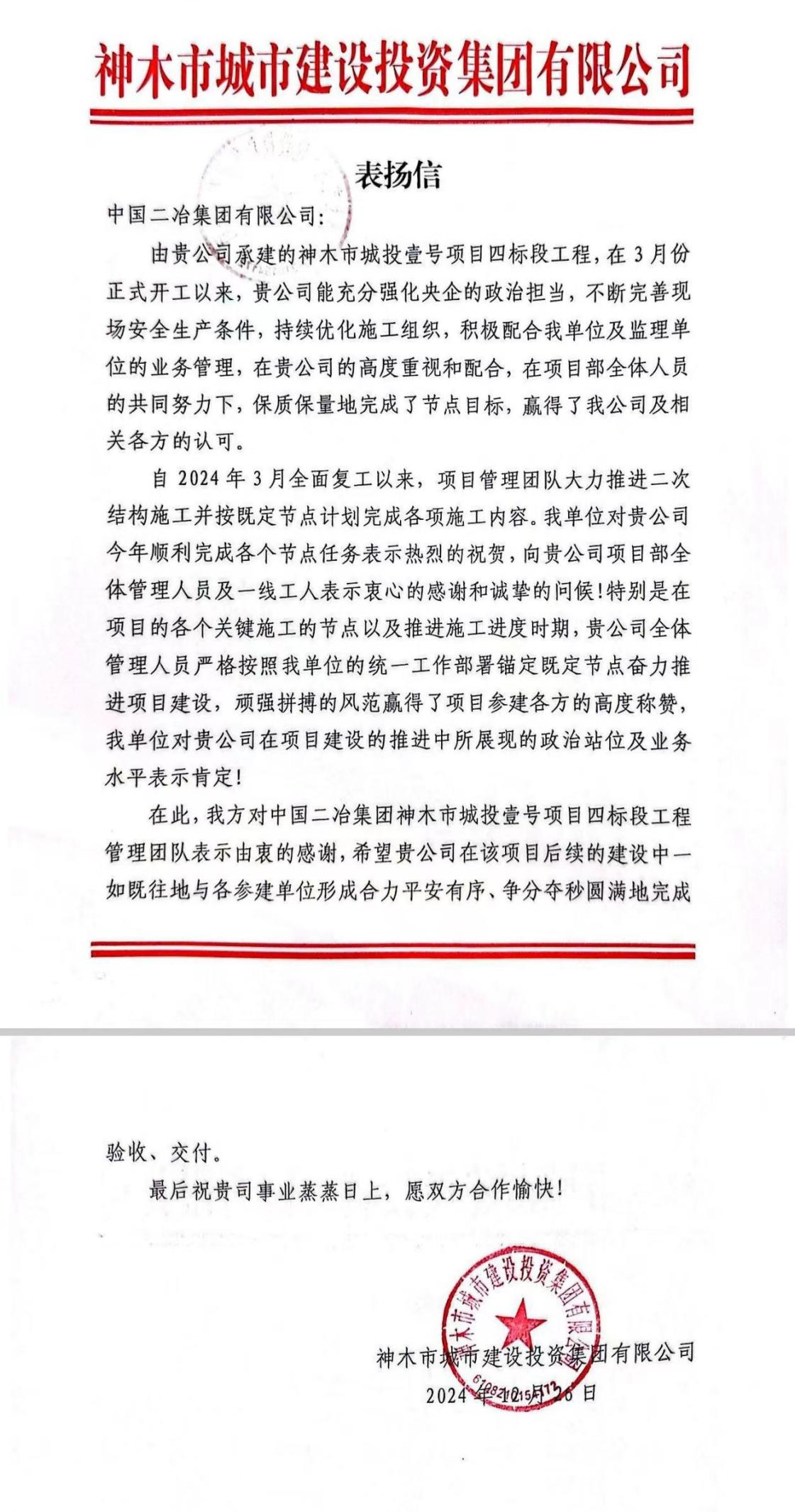 神木市城市建設投資集團有限公司在表揚信中提到:中國二冶項目管理團隊在神木城投壹號項目建設過程中充分發(fā)揮央企擔當,不斷完善安全生產(chǎn)條件,優(yōu)化施工組織設計,保質(zhì)保量完成項目二次結(jié)構(gòu)及其他施工內(nèi)容。神木市城投壹號項目位于神木市東興街以西,四支河路以北麟州路以東后坡路以南,總建筑面積3.5萬平方米。作為神木市重要民生工程之一,該項目從開工建設以來,全體參建人員就以“起步就是沖刺,開局就是決戰(zhàn)”的拼搏姿態(tài),緊密配合,攻堅克難,嚴格按照進度計劃進行施工,做到了抓安全堅持不懈、抓質(zhì)量堅定不移、抓進度毫不動搖,高質(zhì)量高效率完成履約節(jié)點,用實力跑出二冶速度。