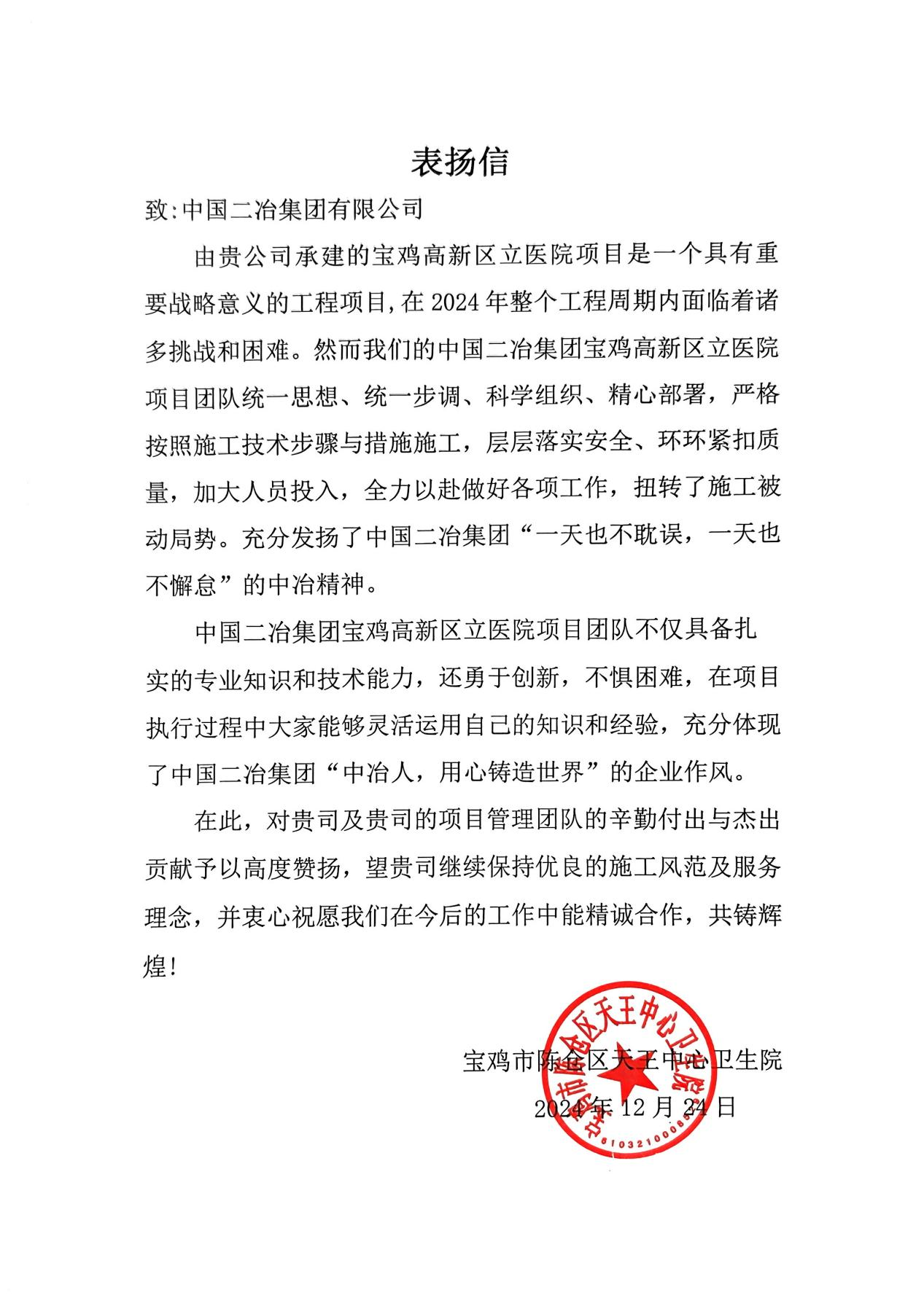 寶雞市陳倉區(qū)天王中心衛(wèi)生院來信對中國二冶寶雞高新區(qū)立醫(yī)院項目管理團隊的辛勤付出與杰出貢獻予以高度贊揚。在2024年建設過程中,項目面臨著諸多的困難和挑戰(zhàn),項目部全體人員統(tǒng)一思想、統(tǒng)一步調(diào)、科學組織、精心部署,層層落實安全、環(huán)環(huán)緊扣質(zhì)量、全力以赴做好項目建設各項工作,扭轉(zhuǎn)了施工被動局勢,項目團隊不僅具備扎實的專業(yè)知識和技術(shù)能力,還勇于創(chuàng)新,不懼困難,充分體現(xiàn)了中國二冶“共建一流項目 合創(chuàng)品牌價值”的企業(yè)經(jīng)營理念。寶雞高新區(qū)立醫(yī)院項目是“十四五”期間寶雞市重點項目,是一所集醫(yī)療、教學、科研、預防、保健、康復于一體的綜合性三級甲等綜合醫(yī)院,建成后將提高寶雞市高新區(qū)區(qū)域衛(wèi)生服務水平,極大緩解寶雞市東部和南部區(qū)域醫(yī)療資源不足的局面。