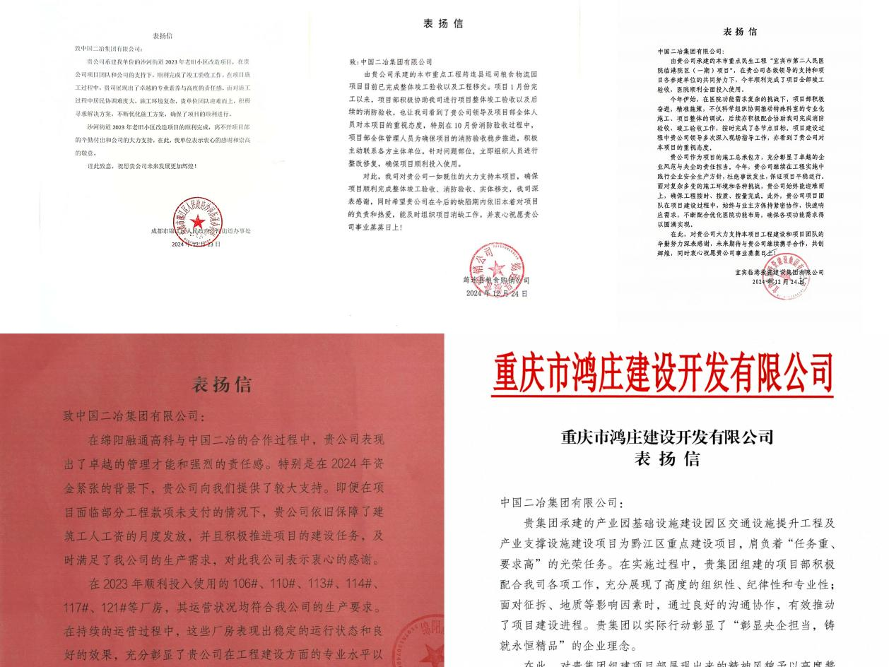 近日,中國二冶連續(xù)收到五封表揚(yáng)信,對宜賓市第二人民醫(yī)院項(xiàng)目、江油15萬噸鋰電池項(xiàng)目、筠連縣巡司糧食物流園項(xiàng)目、重慶黔江產(chǎn)業(yè)園項(xiàng)目、沙河街道2023年老舊小區(qū)改造項(xiàng)目優(yōu)質(zhì)高效完成各項(xiàng)施工任務(wù)給予高度贊揚(yáng)。