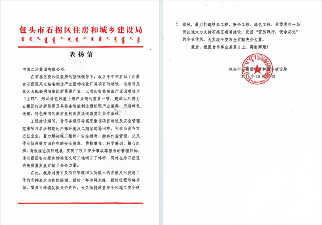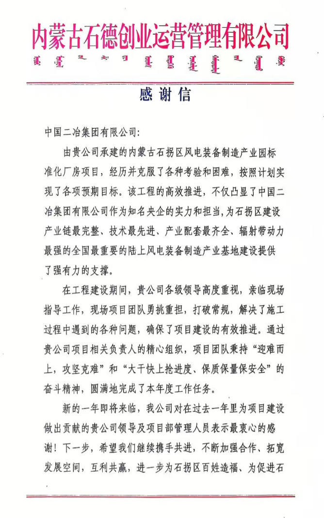 內(nèi)蒙古石德創(chuàng)業(yè)運營管理有限公司在表揚中指出,由中國二冶承建的內(nèi)蒙古石拐區(qū)風電裝備制造產(chǎn)業(yè)園標準化廠房項目,經(jīng)歷并克服了各種考驗和困難,按照計劃實現(xiàn)了各項預期目標。該工程的高效推進,不僅凸顯了中國二冶作為央企的實力和擔當,也為整個石拐區(qū)的產(chǎn)業(yè)項目建設提供了強有力的支撐。
