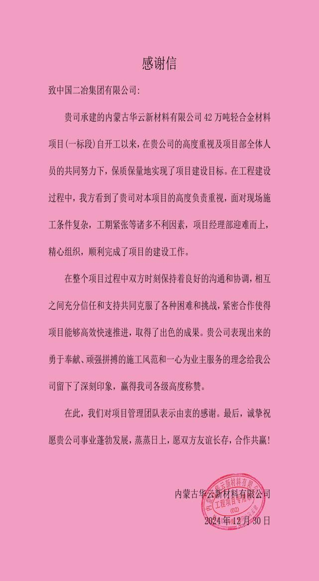 內(nèi)蒙古華云新材料有限公司在表揚信中指出,由中國二冶承建的內(nèi)蒙古華云三期42萬噸輕合金材料項目,在貴公司的高度重視及項目部全體人員的共同努力下,保質保量地實現(xiàn)了項目建設目標,贏得相關方的高度稱贊。