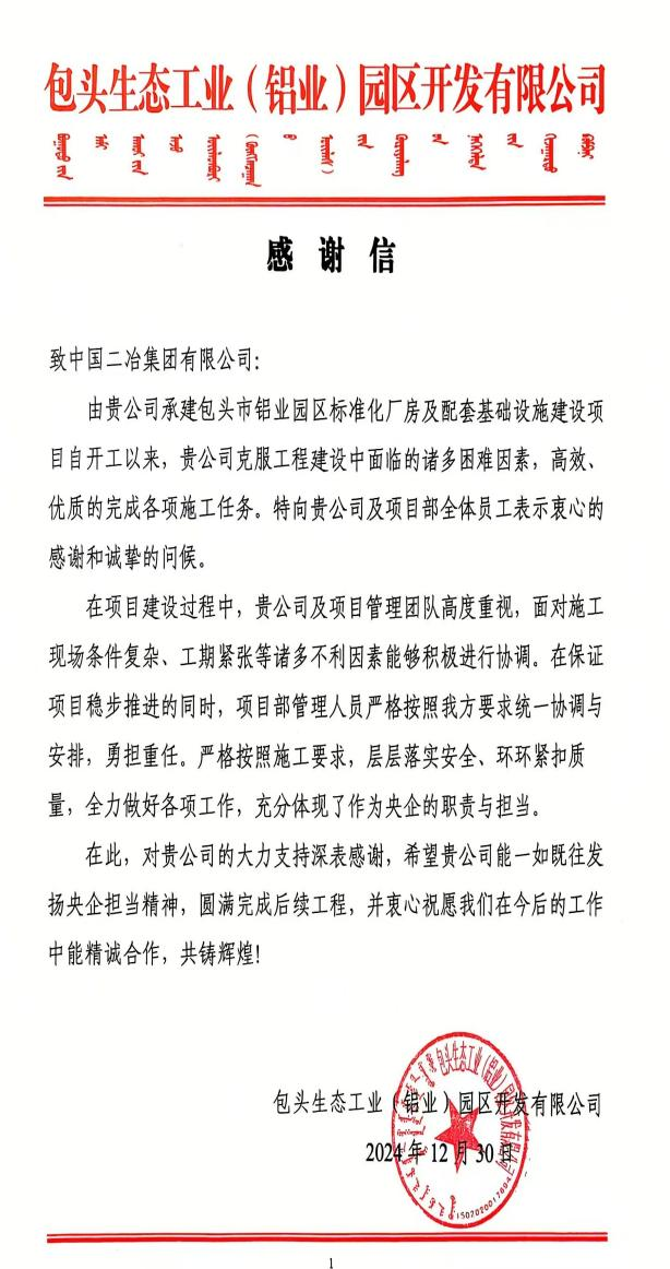 包頭市生態(tài)工業(yè)(鋁業(yè))園區(qū)開發(fā)有限公司在表揚信中指出,由貴公司承建包頭市鋁業(yè)園區(qū)一期標準化廠房及配套基礎設施建設項目自開工以來,貴公司克服工程建設中面臨的諸多困難因素,高效、優(yōu)質地完成了各項施工任務。