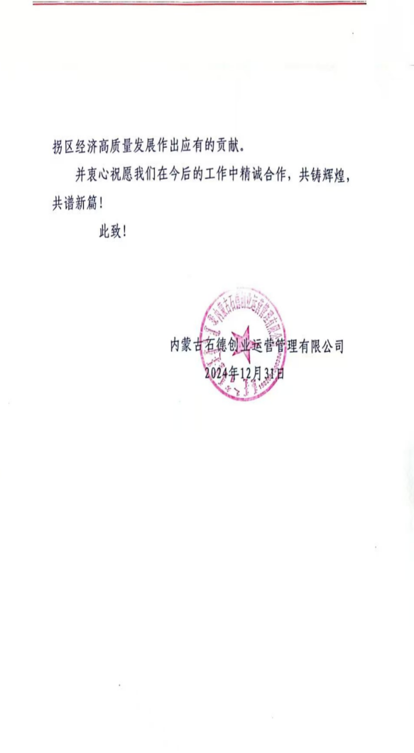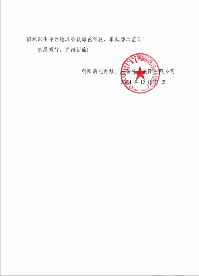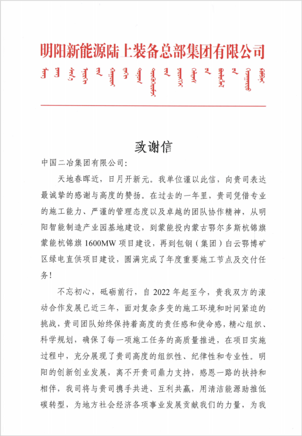 明陽智慧能源集團股份公司在感謝信中指出,2024年,貴司憑借專業(yè)的施工能力、嚴謹?shù)墓芾響B(tài)度以及卓越的團隊協(xié)作精神,從明陽智能制造產(chǎn)業(yè)園基地建設,到蒙能投內(nèi)蒙古鄂爾多斯杭錦旗蒙能杭錦旗1600兆瓦項目建設,再到包鋼(集團)白云鄂博礦區(qū)綠電直供項目建設,圓滿完成了年度重要施工節(jié)點及交付任務。