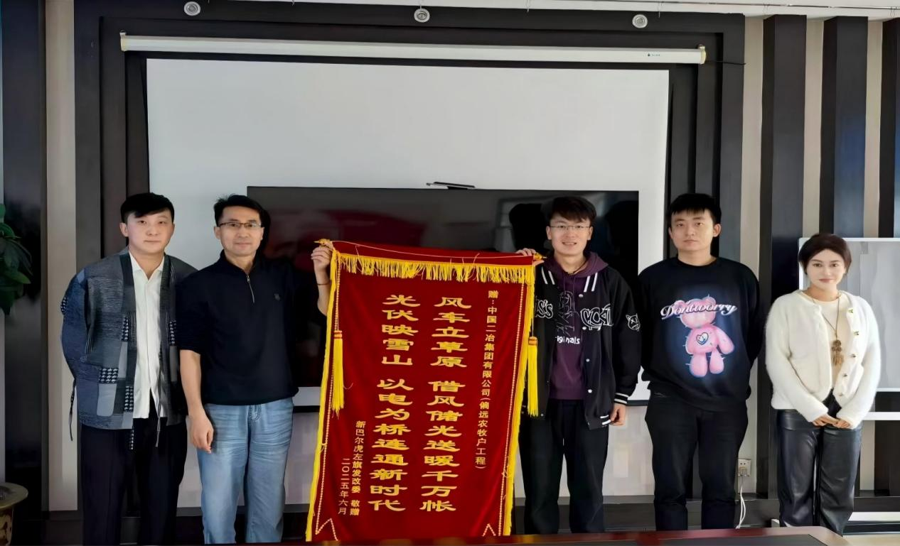 錦旗上題寫“風(fēng)車立草原,借風(fēng)儲(chǔ)光送暖千萬帳;光伏映雪山,以電為橋連通新時(shí)代”,生動(dòng)詮釋了項(xiàng)目的核心價(jià)值與深遠(yuǎn)意義。新巴爾虎左旗政府表示,該項(xiàng)目地處內(nèi)蒙古偏遠(yuǎn)牧區(qū),氣候條件惡劣、交通出行不便,整體施工環(huán)境極為艱苦。面對(duì)挑戰(zhàn),項(xiàng)目管理團(tuán)隊(duì)充分發(fā)揮技術(shù)與管理優(yōu)勢(shì),始終以“高標(biāo)準(zhǔn)、高質(zhì)量、高效率”為施工準(zhǔn)則,全力克服物資運(yùn)輸困難、極端天氣影響等多重難題,最終如期完成節(jié)點(diǎn)任務(wù)。該項(xiàng)目的順利推進(jìn),不僅成功解決了當(dāng)?shù)剞r(nóng)牧民的急難愁盼問題,直接惠及數(shù)百戶農(nóng)牧民家庭,顯著提升了牧區(qū)群眾的生活品質(zhì);更通過產(chǎn)業(yè)配套升級(jí),為當(dāng)?shù)亟?jīng)濟(jì)可持續(xù)發(fā)展注入了新動(dòng)能,為邊疆牧區(qū)發(fā)展奠定了堅(jiān)實(shí)基礎(chǔ)。